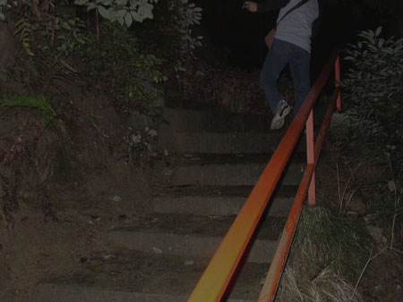 ここで一旦車に引き返した私たちはデータをもう一度読み直し、しっかりとポイントを掴み出直しました。 情報通り、八幡市駅から男山へ向けて伸びるケーブルカーの駅を確認。 そこから少し行くと・・・・ありました! 「この階段は八幡宮へ行けません」これが目印です。 実はこの階段、ひとつの階段のように見えますが、右側の黒っぽい部分とその左側の白っぽく見える部分で、二手に分かれています。 その一方を進みます。 |