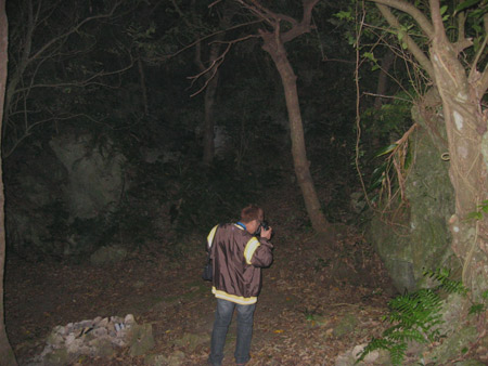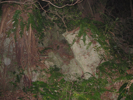 岩の下部を慎重に観察すると、妙な空間が出来ている岩がいくつも存在している事に気付きました。 その空間は明らかに人工的に削られた思われる部分と、自然に溶けて出来たように見える部分が存在しているようです。 岩に溶けている部分が存在している事から、この岩は石灰岩で出来ているのでしょうか? 更に岩には煤が付着していることから、この岩も拝所なのかもしれません。 |
