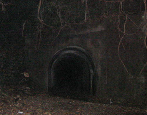 道の様子が変化してから少し進むと、思った通りトンネルが姿を現しました。 トンネルの前には土砂が堆積していて、現在使用されているトンネルにはとても見えません。 しかもトンネル入り口付近には、植物のツルか根なのか分からないものが垂れ下がっていて、かなり不気味な感じです。 闇に浮かぶトンネル内は気のせいか、更に暗さを増しているように感じがして嫌な雰囲気なのですが、中に入ってみる事にします。 |