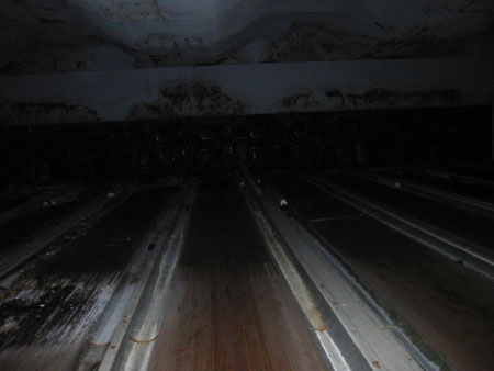 湿気の影響からか、レーン一面にカビが生え白くなっています。 ピンデッキの方から微かに気配を感じますが、嫌な感じはあまりしません。 それより「ピチャッ」「ピチャッ」という耳障りな音がさっきより少し大きくなったような気がしてかなり気になりますが、取りあえずレーンの端まで来たので、戻る事にします。 |