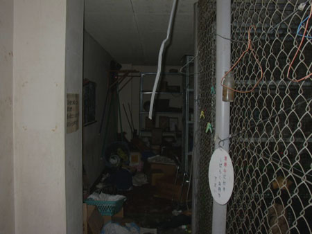ハウスシューズの貸し出しフロントです。 中にはまだシューズが大量に残され、シューズにはホコリが溜まっています。 廃墟となっても貸し出し用のシューズは誰も持ち帰らないようです。 |