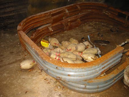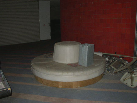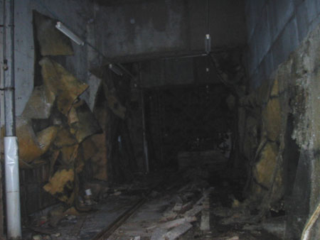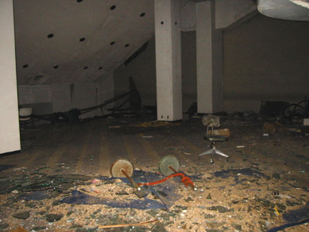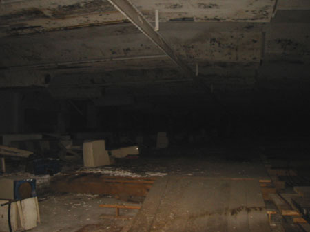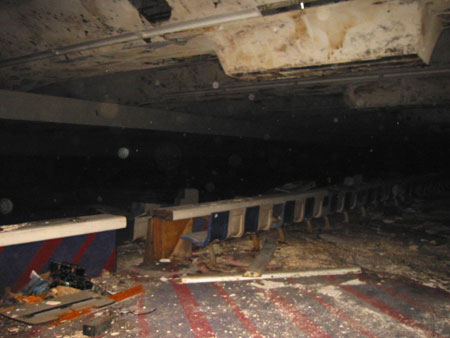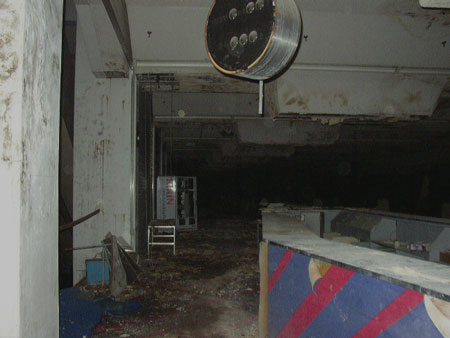 レーンに戻ってきました。 レーン板が外された床が所々白くなっています。 この白い物は、場内に住む鳩のフンが堆積したものですが、かなり臭います。 どうやら天井には鳩の巣がかなり有るらしく、常に「ガサガサ」と音がしていました。 このボウリング場で、「人気の無いレーンからガサガサという音がする」という噂を聞いた事が有りますが、多分鳩の動く音を聞いたのだと思います。 |