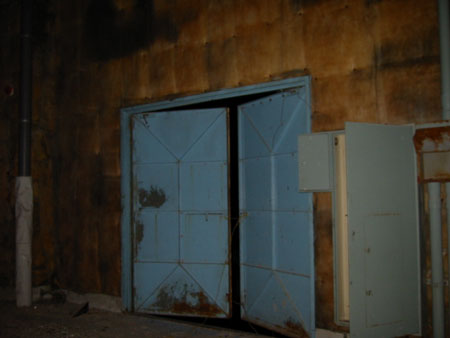 通路を歩いて行くと開きかけた大扉を発見しました。 扉の大きさから見て、人の出入り口用の扉では無さそうです。 扉の向こうには何が有るのでしょうか? 気になるので入ってみようと思い、少し開いた扉から様子を伺うと、扉の向こう側は外になっていました。 どうやらこの扉はクレーン等により外から設備等を搬入する為に設けられた扉のようです。 ともあれ、この扉が迂闊な探索者を誘う天国の扉にならない事を祈ります。 |